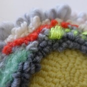 周囲を色々な色が混じった白の極太メランジウールとグレーのスラブヤーンで仕上げてるところがポイント。